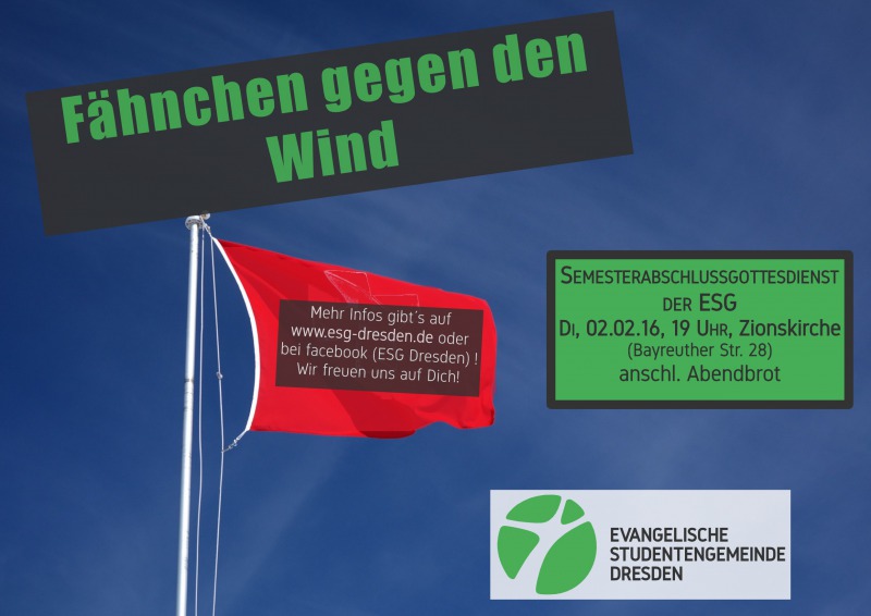 So, wie wir das Semester begonnen haben, wollen wir es auch am Ende schließen: Mit einem Gottesdienst. Im Anschluss an den Gottesdienst wird noch einmal gemeinsam richtig gefeiert. Referent*in: Vertrauensstudenten Termin(e): Dienstag, 02. Februar 2016 - 19:00Ort: Zionskirche