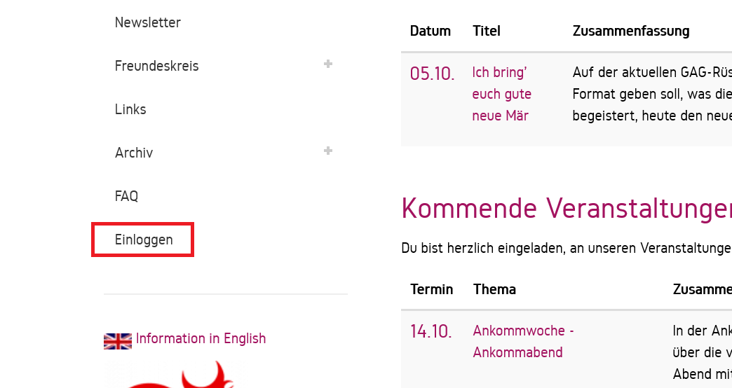 Zuerst meldest du dich mit den Daten an, die du bereits verwendet hast, oder die dir geschickt wurden. Zum Login verwendest du den Button Einloggen im linken Menü, ganz unten.